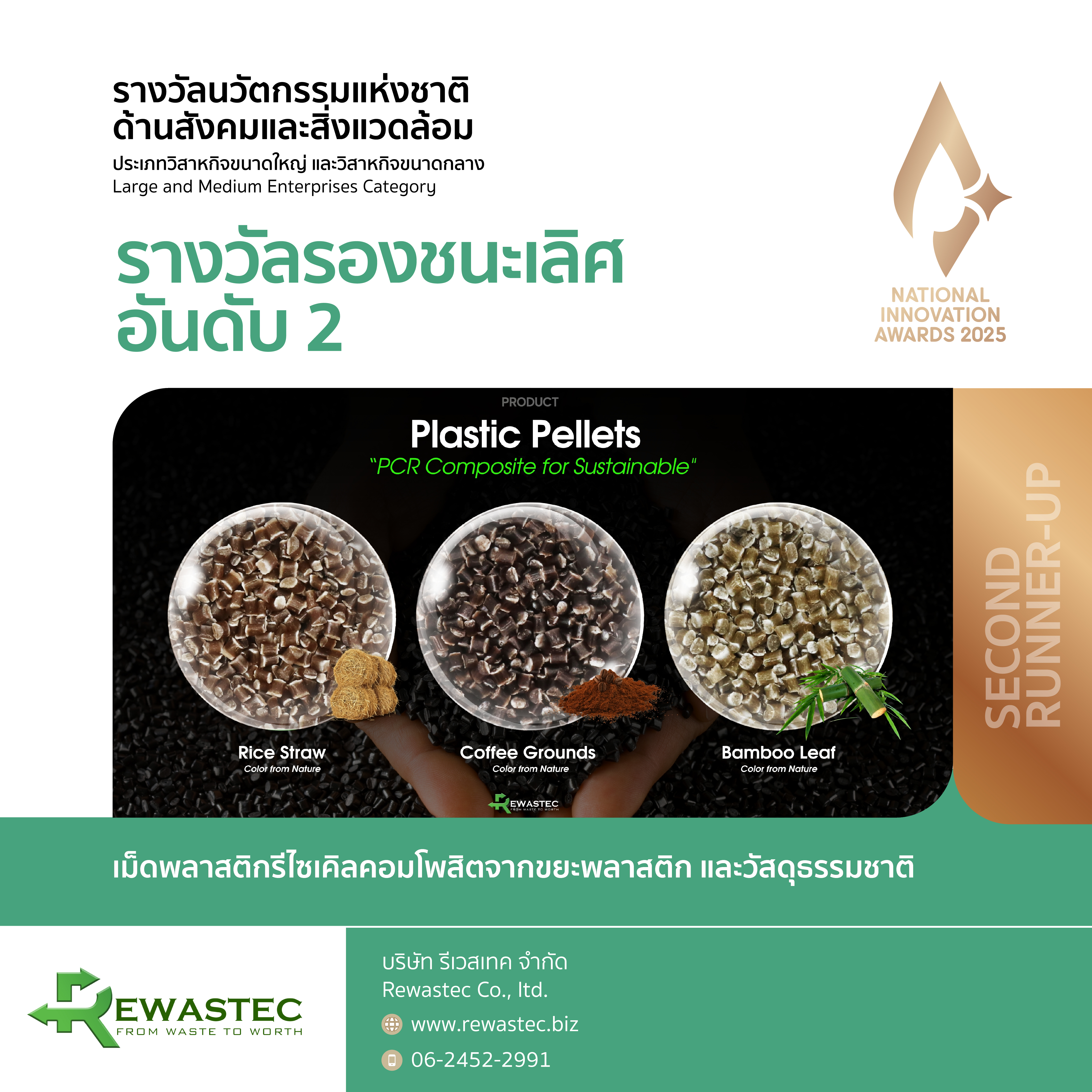 เม็ดพลาสติกรีไซเคิลคอมโพสิตจากขยะพลาสติกและวัสดุธรรมชาติ จากพลาสติกใช้แล้ว ผสมวัสดุธรรมชาติ เช่น ฟางข้าว กากกาแฟ ใบไผ่ ผลิตด้วยเทคโนโลยีอัดรีดสองสกรู สร้างสูตรพลาสติกคอมโพสิตคุณภาพสูงกว่า 400 สูตร ลดขยะ เพิ่มมูลค่าทรัพยากร และรักษาสิ่งแวดล้อม